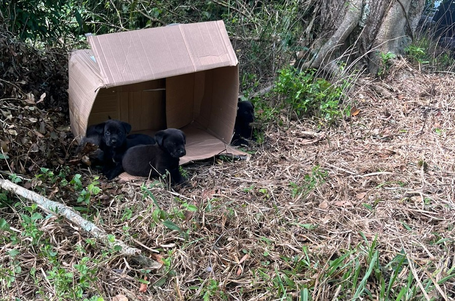 Nas proximidades da Gruta Municipal, quatro filhotes de cães foram encontrados no interior de uma caixa de papelão, em situação de abandono. Os policiais acolheram os animais e forneceram água e alimento.
